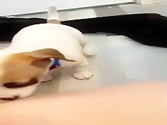 Cute chick puts peanut butter on her pussy and asshole and lets her dog lick
