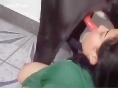 Cute teen from Brazil tries to get her dog to lick her pussy