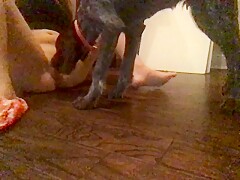 Cute chick puts peanut butter on her pussy and asshole and lets her dog lick