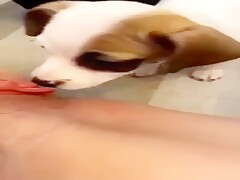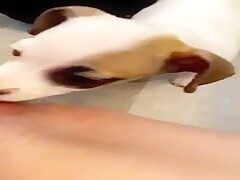 Cute chick puts peanut butter on her pussy and asshole and lets her dog lick